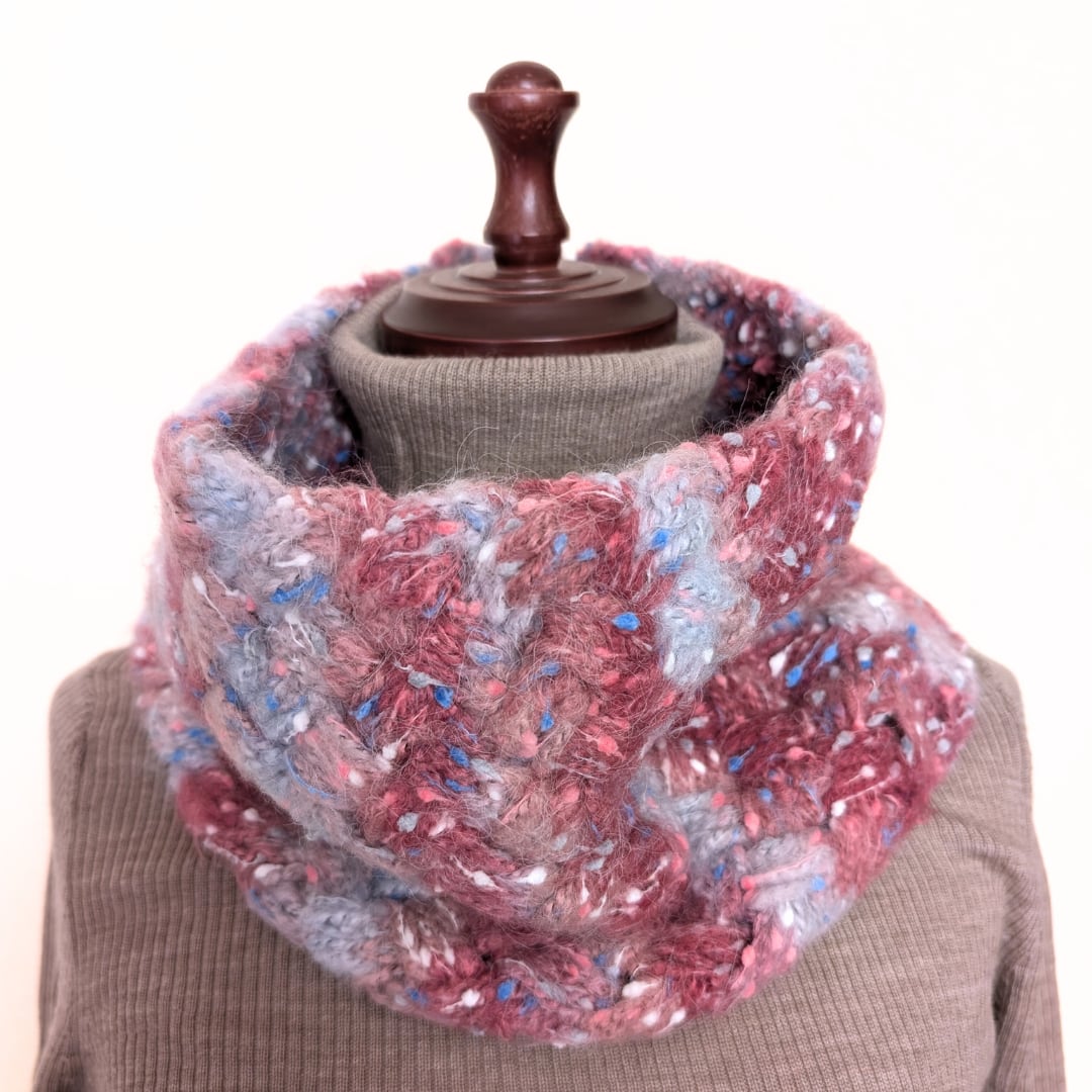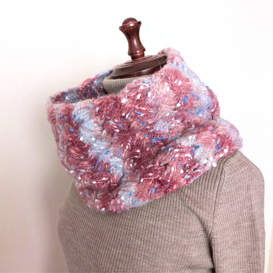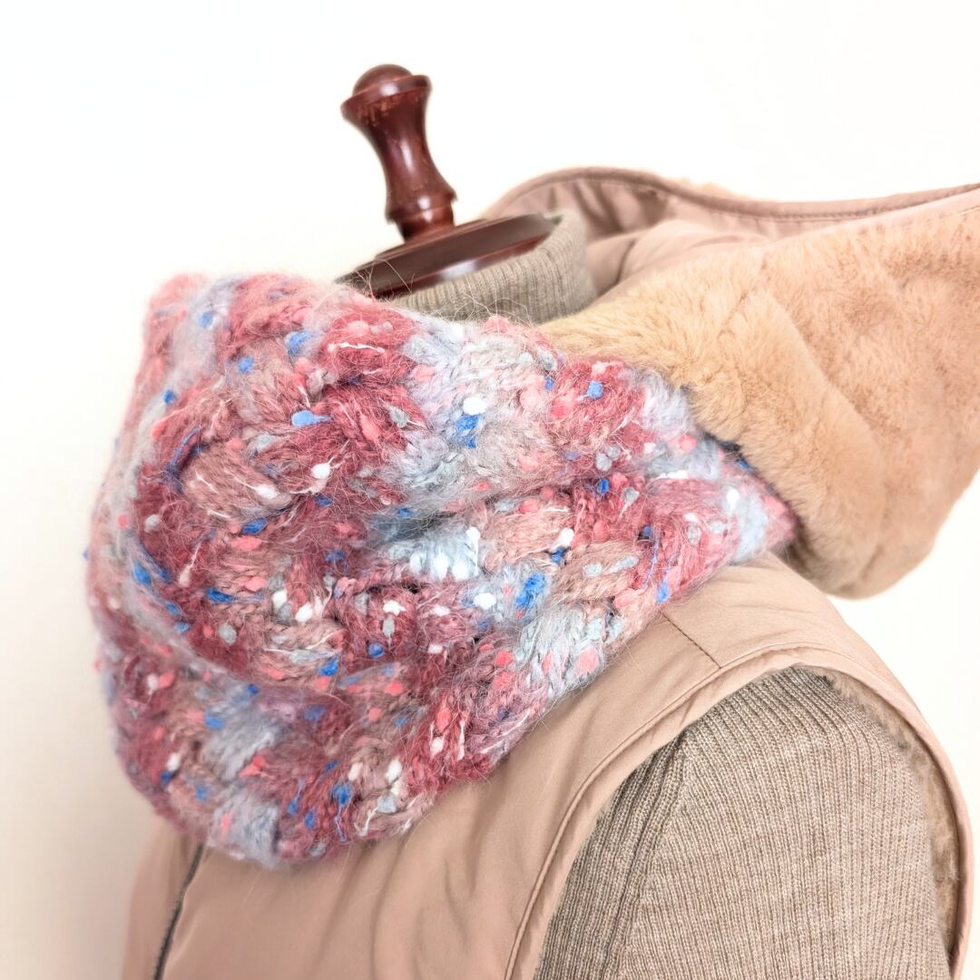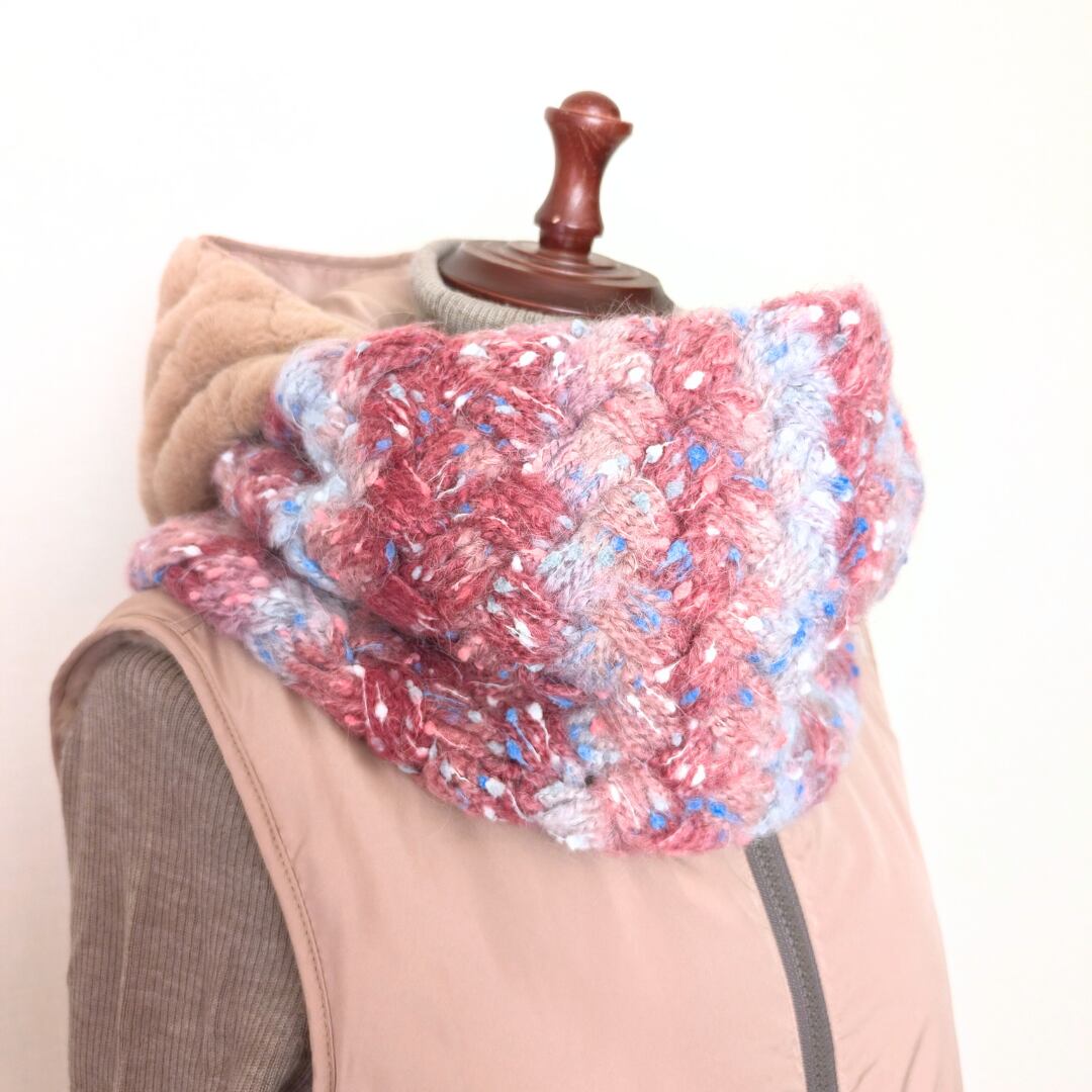 このスヌードは、通常のサイズよりも大きくデザインされており、フード付きの上着とも合わせやすいスタイルです。