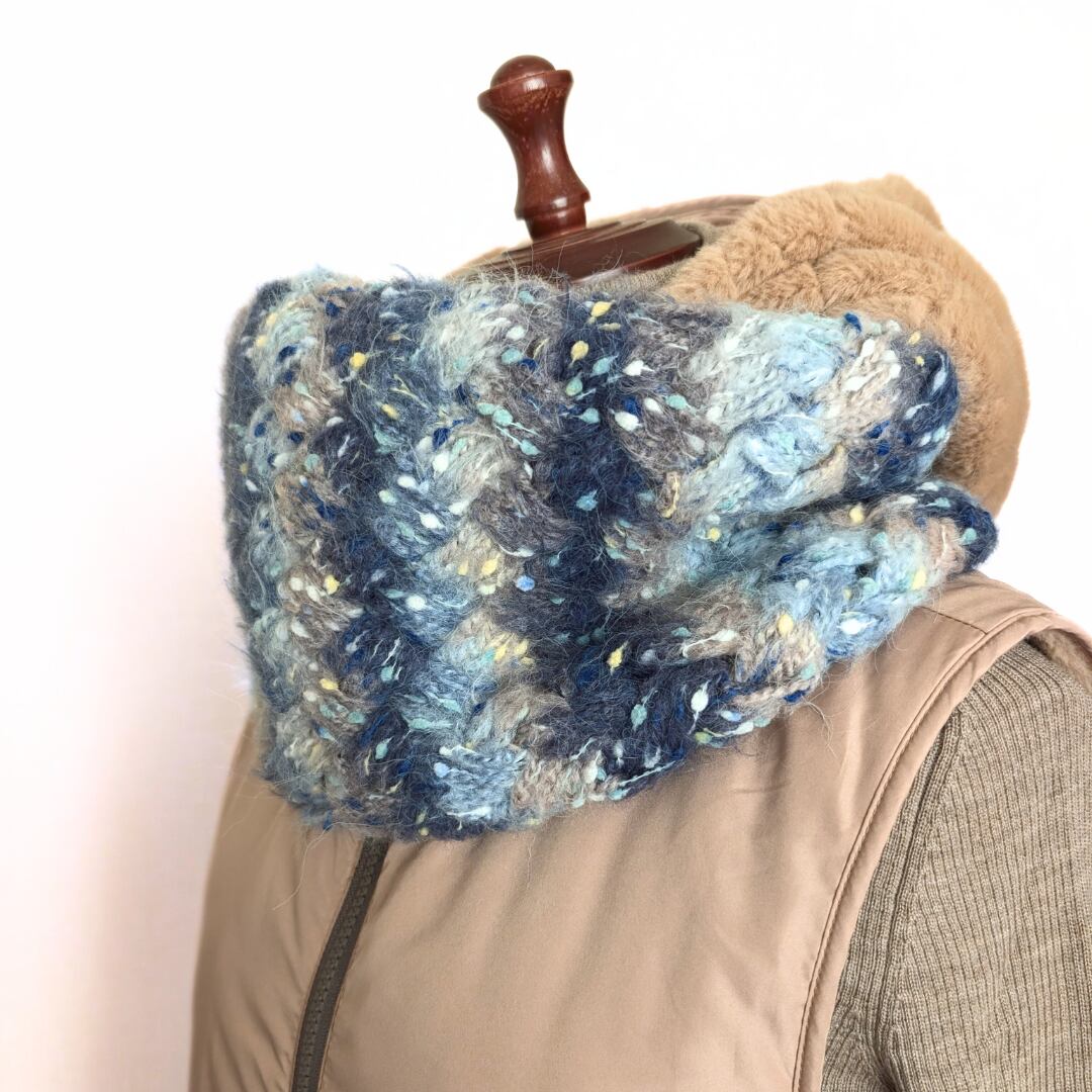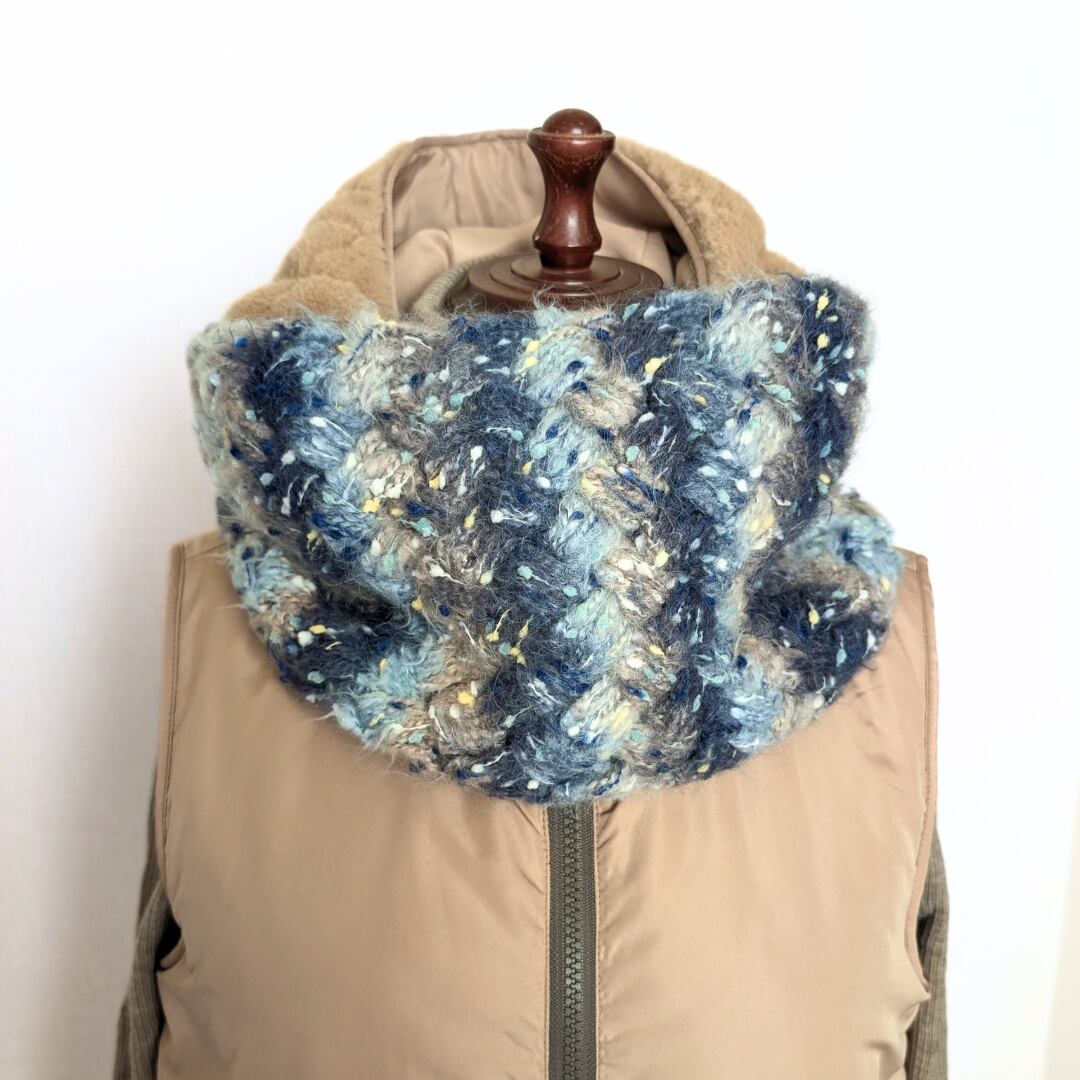 このスヌードは、通常のサイズよりも大きくデザインされており、フード付きの上着とも合わせやすいスタイルです。