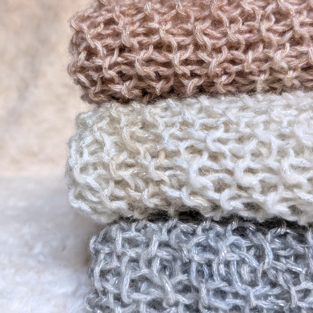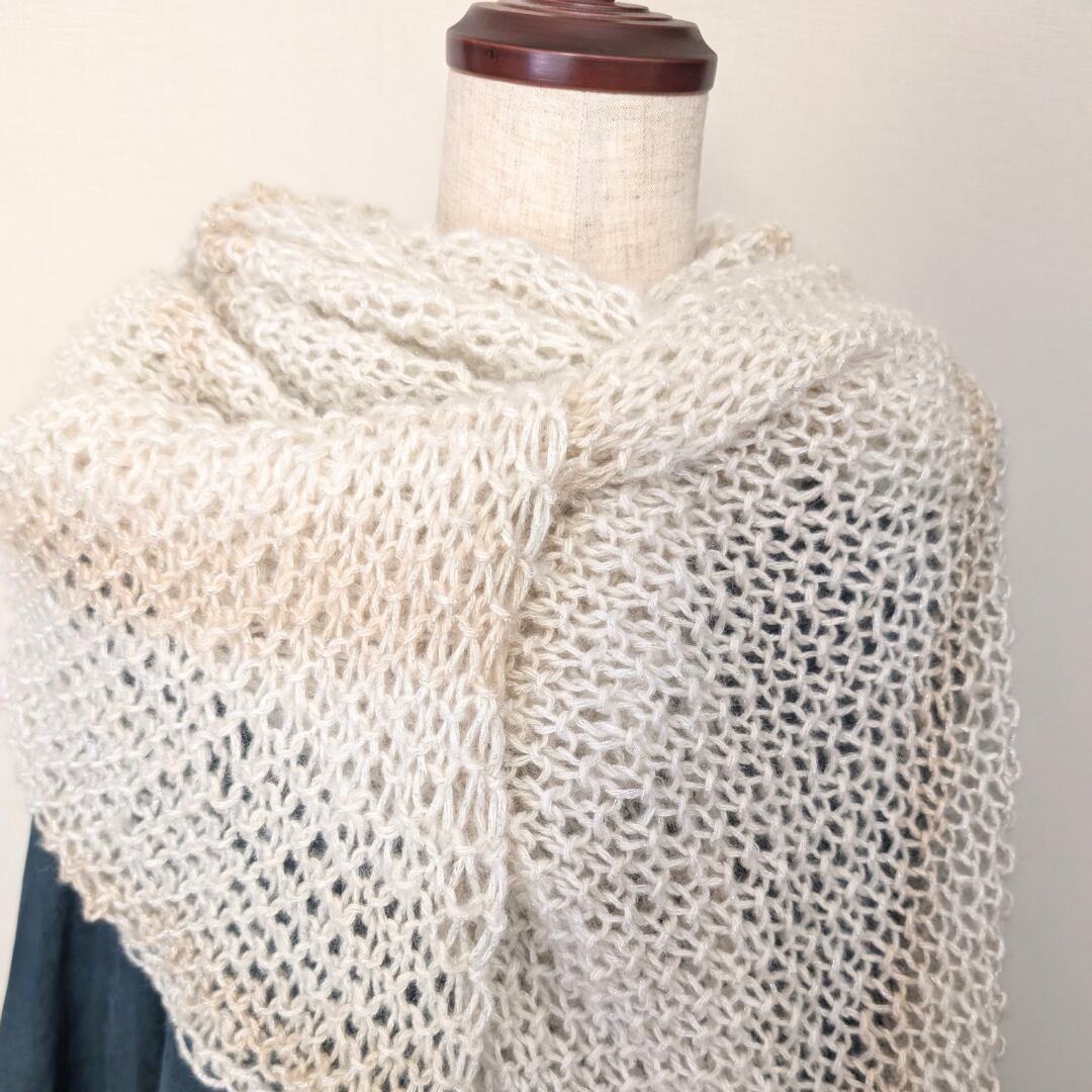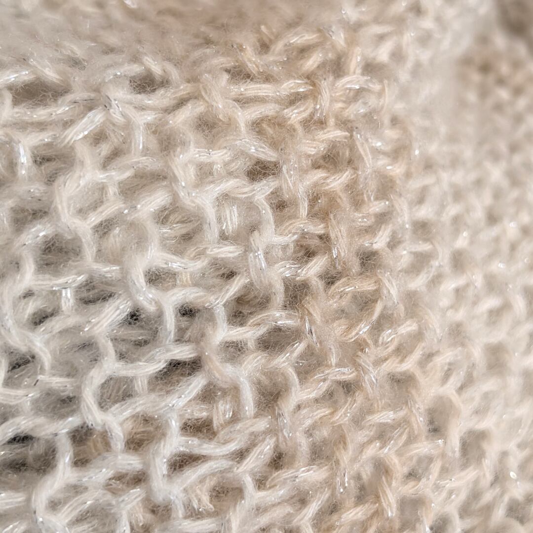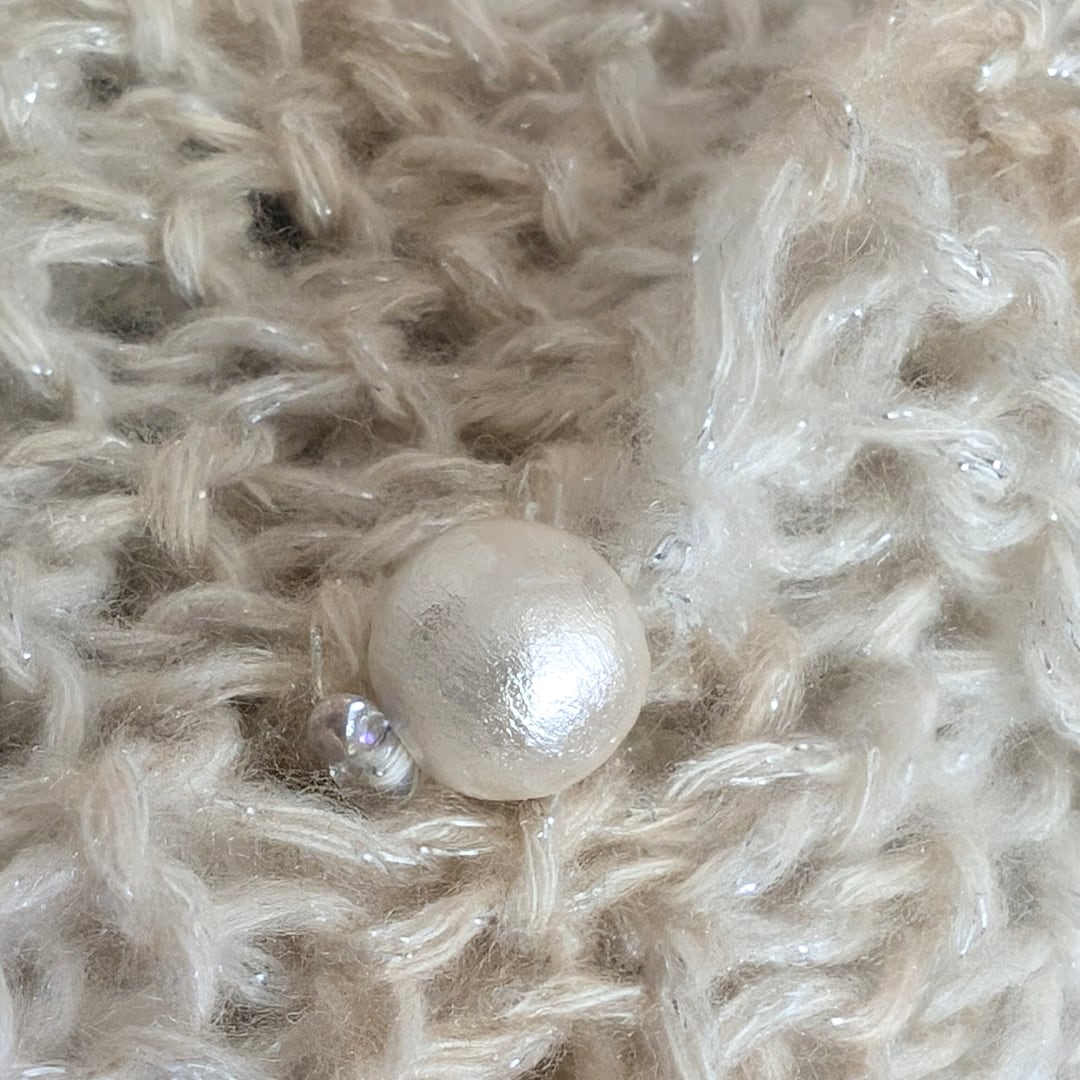 オフホワイトと淡いベージュのグラデーションカラーは、どんなコーディネートにも自然になじみます。さらに、さりげない銀色のラメ糸が、光や動きに合わせて上品なきらめきを演出。特別な日にも、普段使いにもぴったりです。
